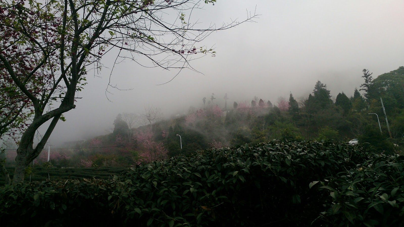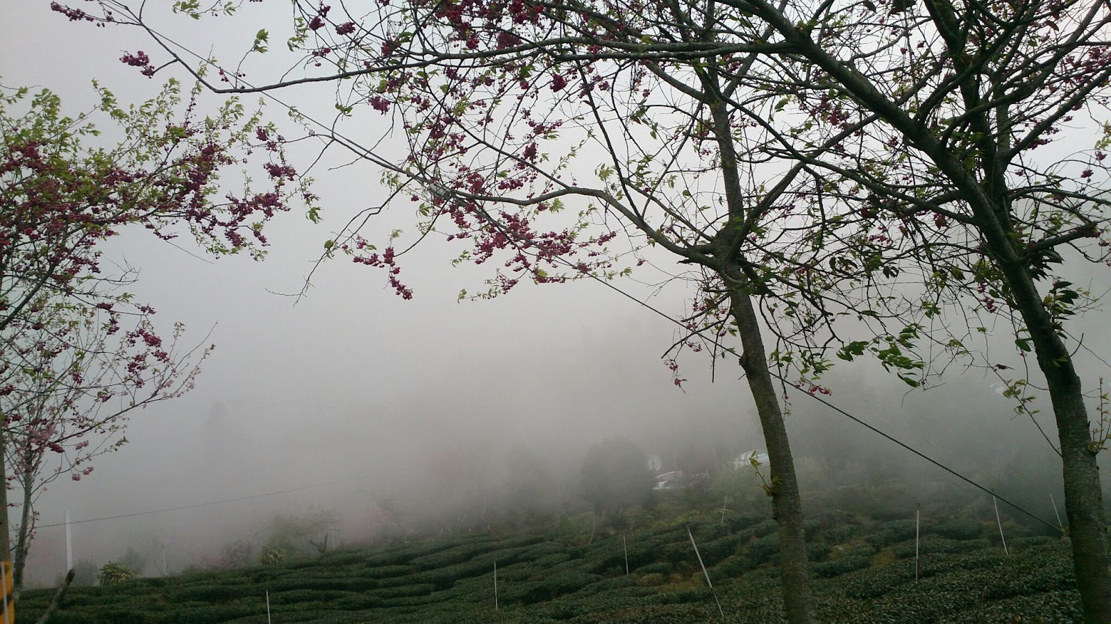 大開在雲霧繚繞中的粉櫻~從翠綠的茶園中遠遠望去~更像是幅畫~